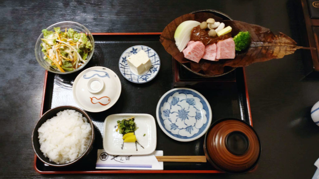朴葉味噌ステーキ御膳を頂きました。飛騨高山地方の郷土料理で朴葉の上に味噌をのせて焼いた朴葉味噌で飛騨牛を頂くという贅沢なメニューでした。味噌の味がかなり美味しくお肉は甘い脂とコリコリとした食感でした。味噌と一緒に食べるとこれがまた美味しかったです。朴葉味噌ステーキ以外のお料理もそれぞれ美味しかったです。