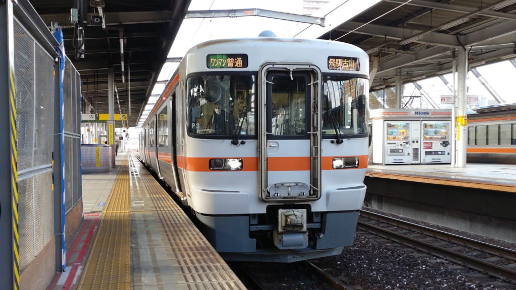 という事で引き続き普通列車の旅は続きます。ひだ号の行く先と同じく高山本線の列車に乗ります。車両はキハ25形。見た目は前の日から沢山のってきた313系電車にそっくりですが、高山本線は非電化区間なのでこちらは電車ではなくディーゼルエンジンで動く気動車です。