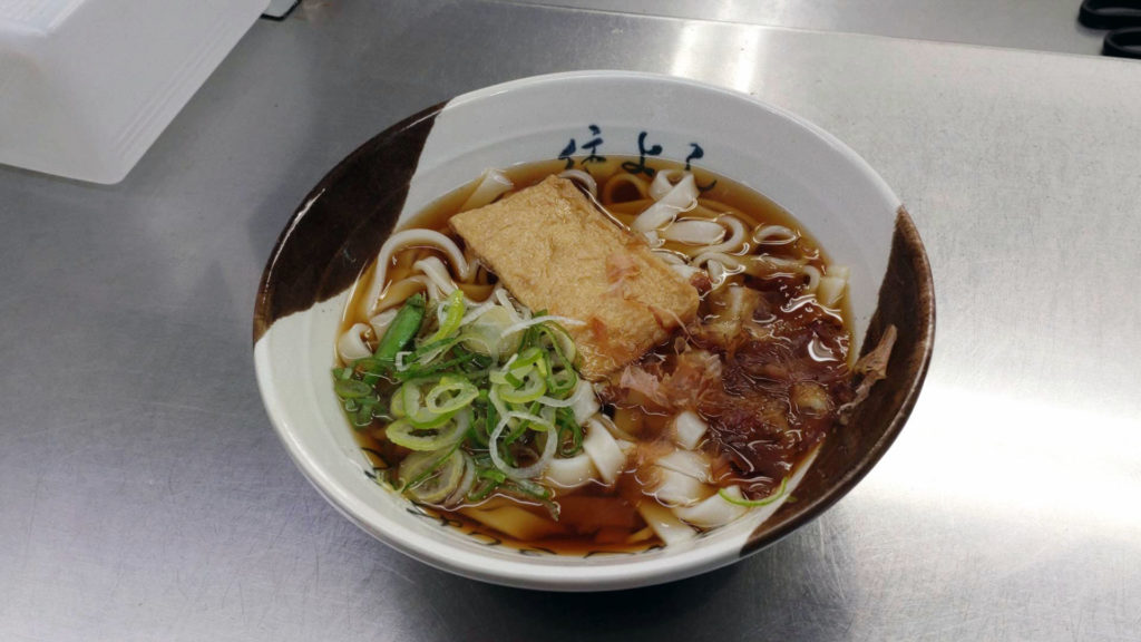 きしめんを頂きました。一番シンプルなメニューですが、油揚げ、ネギ、鰹節がのっています。ダシの効いた汁とツルツルした麺がとても美味しかったです。