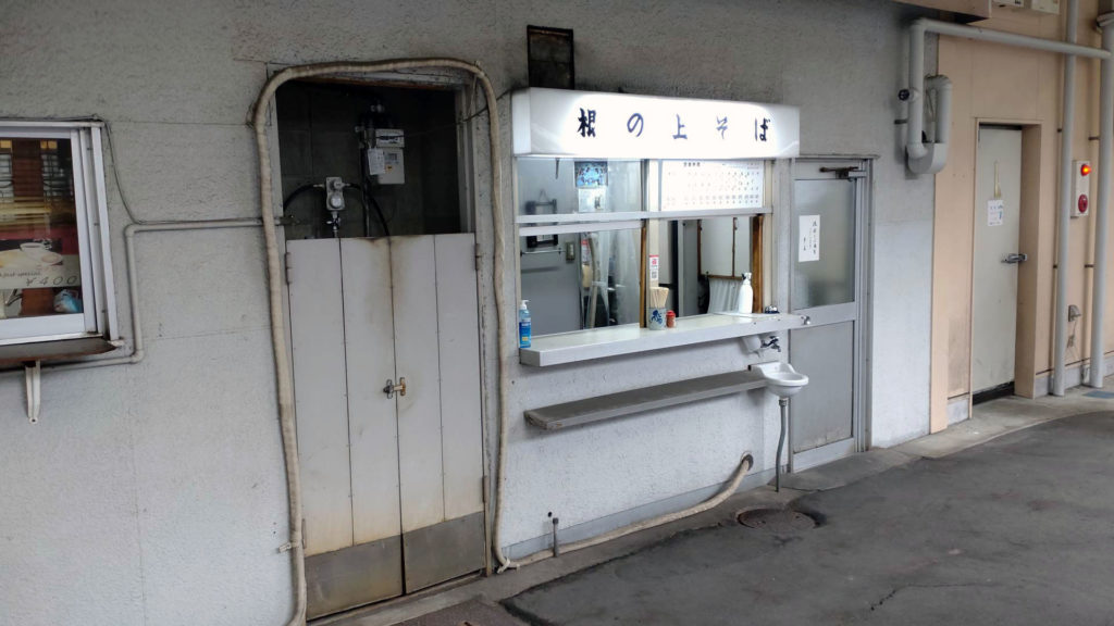 ここで列車待ちの時間が30分ほどあったので昼ご飯を頂きます。根の上そば 梅信亭 という立ち食いそば屋さんで、カウンターが改札内と改札外の待合室の両方にあって真ん中に厨房があるような作りになってます。こちらは改札の中のカウンター。店員さんは厨房に1人しかいないようなのでこちらで注文するときは呼び鈴を鳴らしてこちら側に来てもらって食べたいものを伝えるようです。