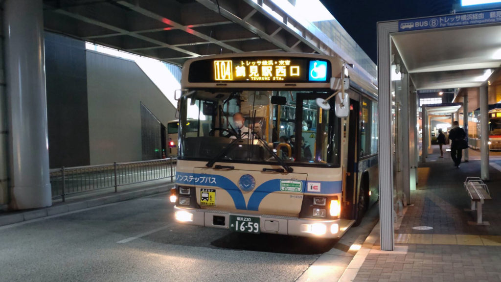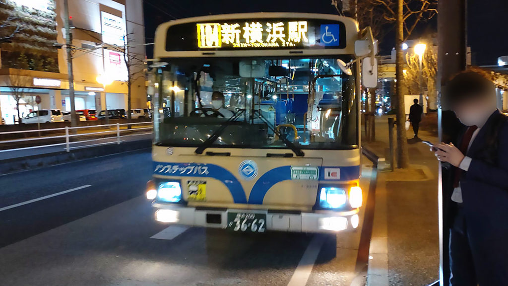 トレッサ横浜の前にあるバス停から横浜市営バスに乗ります。車両は日野自動車の大型路線バスのブルーリボンII