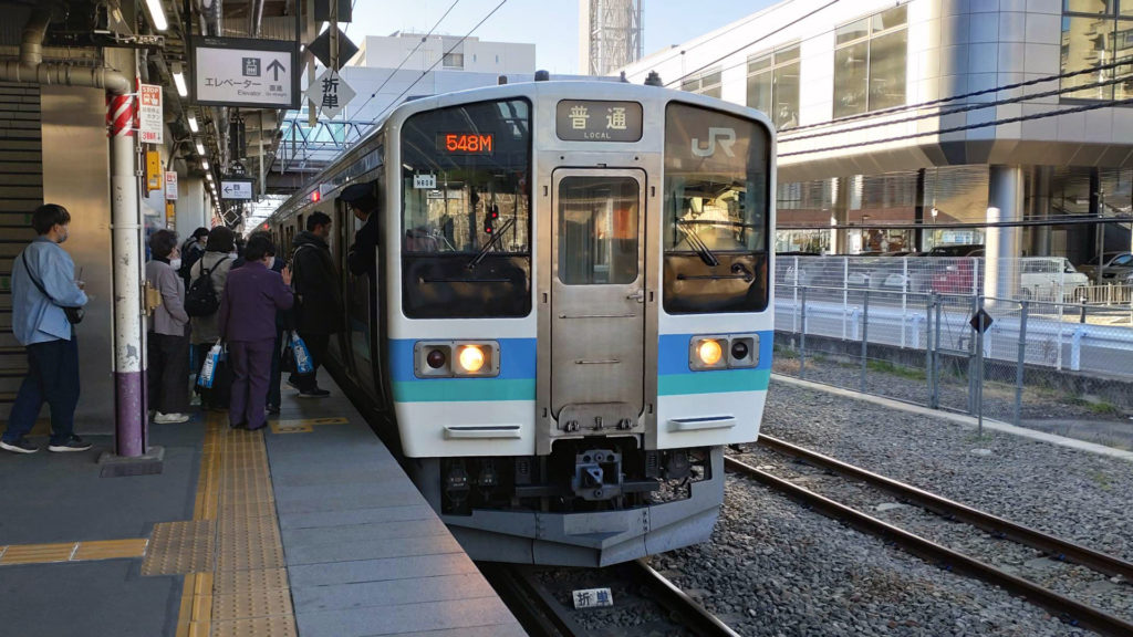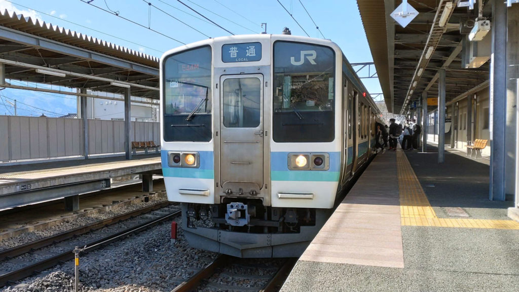 美味しいほうとうも食べて満足したので、まだ早い時間ですが甲府駅を出発します。中央線の列車で車両は211系2000番台。2000番台の211系は全席ロングシートですが3扉なのでかなり長いロングシートです。