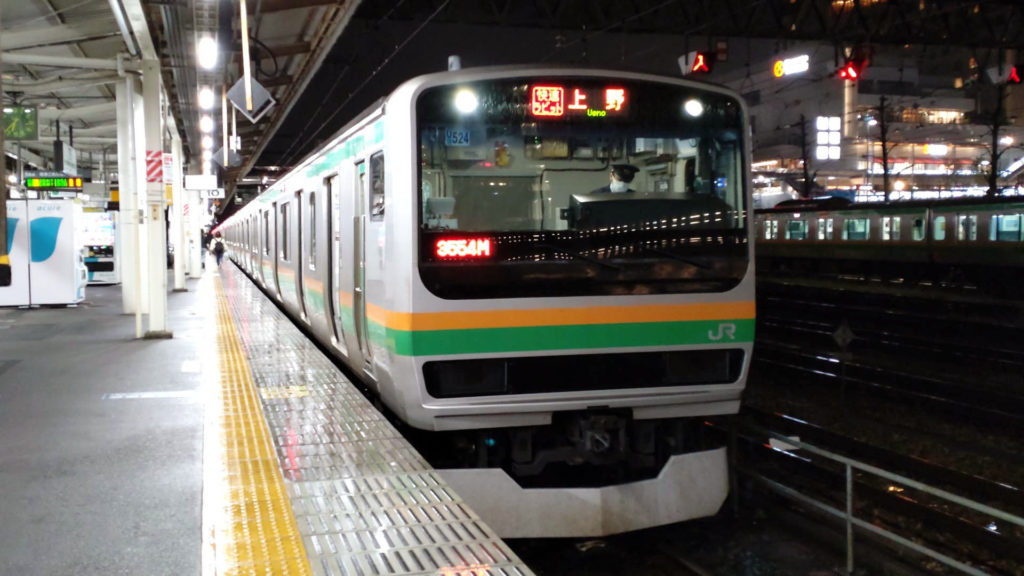 宇都宮駅で東北本線では最後の乗換です。車両はE231系1000番台。宇都宮駅からは一気に10両以上(10両または15両)の長編成になります。今回乗った列車は上野駅行きですが上野東京ラインで東海道線へ乗り入れる列車や湘南新宿ラインで横須賀線へ乗り入れる列車も宇都宮駅始発があります。