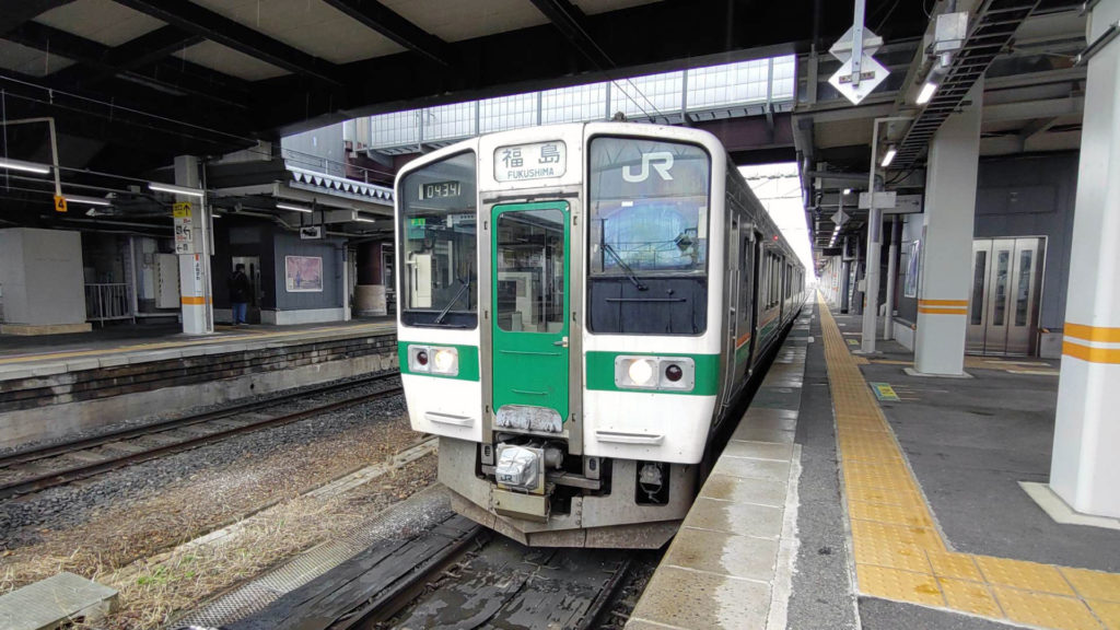まずは奥羽本線(山形線)の列車に乗ります。福島駅までは隣に停まってる山形新幹線と同じ線路を通りますが普通列車なので結構時間かかります(笑)車両は701系5500番台。