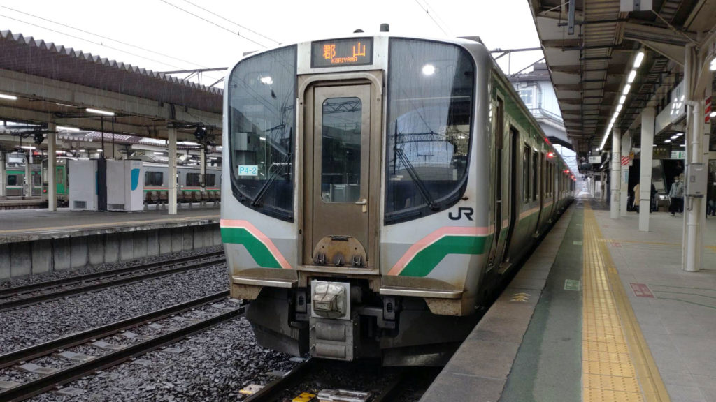 郡山駅に到着です。郡山駅は東北本線や東北新幹線の他、前日に常磐線で乗換した時に降りた いわき駅までの磐越東線と、磐梯熱海駅や喜多方駅などを通り新潟方面に向かう磐越西線も乗り入れています。磐梯熱海で行ってみたい温泉があったり喜多方へラーメン食べに行きたいなと思って計画を立てたけど実現してない旅があるのでそのうちまた来たいと思います。