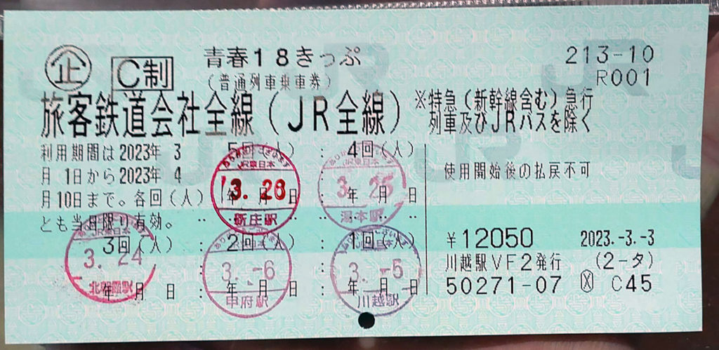 青春18きっぷの最後の5回目にスタンプを押してもらいました。3日目は山形県から埼玉県まで普通列車のみで帰るのでほぼ1日移動する日になります。