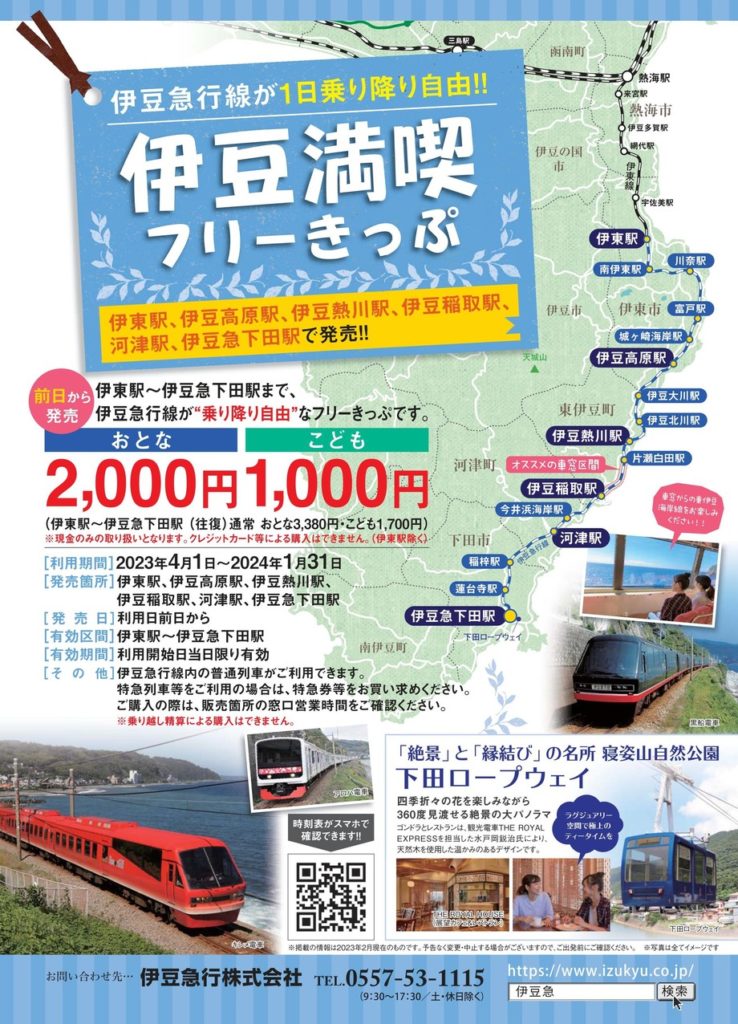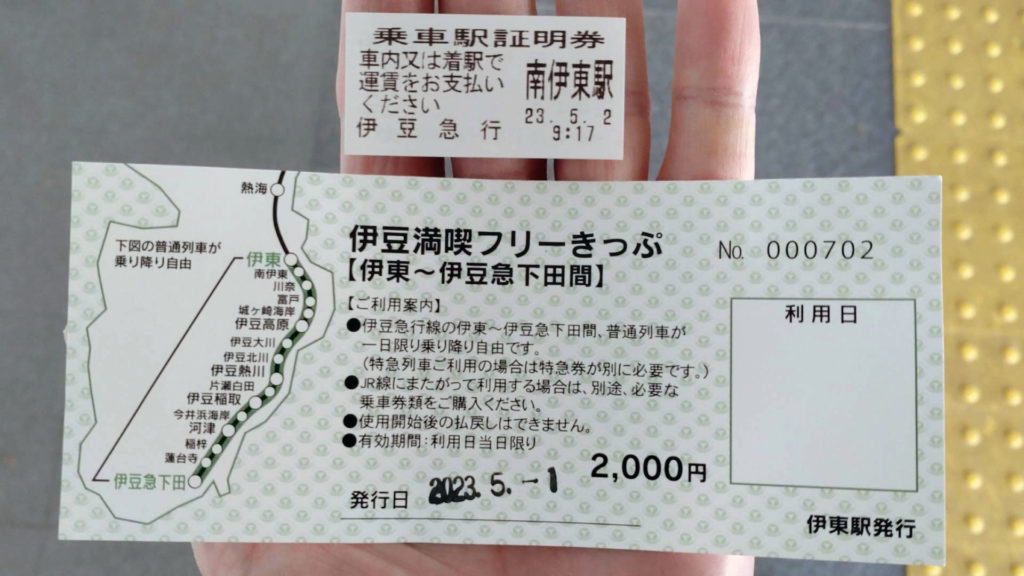 2023年の伊豆満喫フリーきっぷはこのパンフレットにあるように販売しているどの駅でも前日に購入することができるのですが、2022年の時は伊東駅だけは前日購入ができず当日購入のみでした(2023年は伊東駅でも前日から帰るようになった)。そんな感じで毎年微妙にルールが違うきっぷなので、旅行の計画を立てたり購入する場合は伊豆急のHPの おトクなきっぷ のページで最新の情報の内容をよく確認してから購入した方が良いです。(確か、過去には伊東駅でしか購入できなかった年もあったような記憶が有ります)