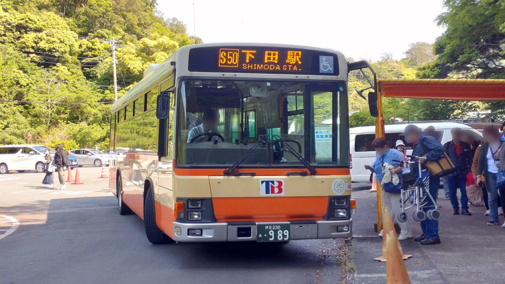 伊豆急下田駅の駅前のバス停から東海バスの路線バスに乗ります。車両はいすゞの大型路線バスのエルガ。