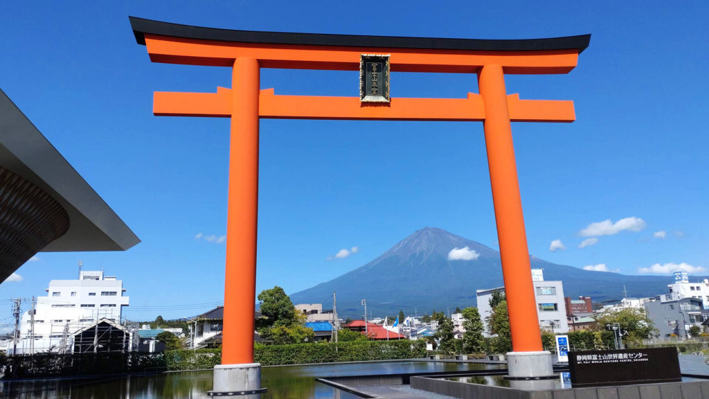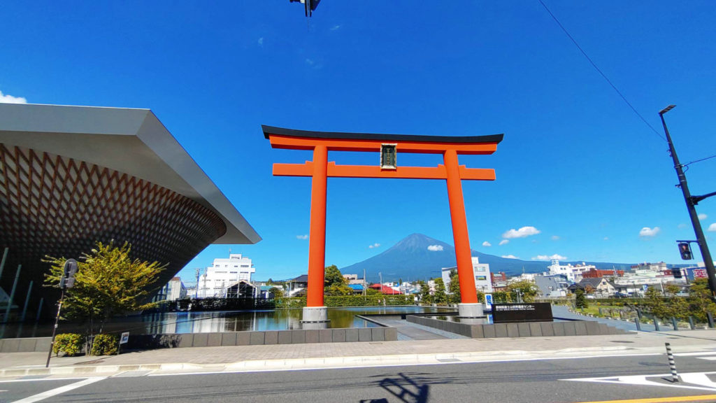 以前、身延線に乗っていた時に列車の窓から見えて気になっていた大きな鳥居のある所に来ました。こちらの鳥居も浅間大社の一部のようです。鳥居の奥に富士山が見えるのとてもいい風景でした。