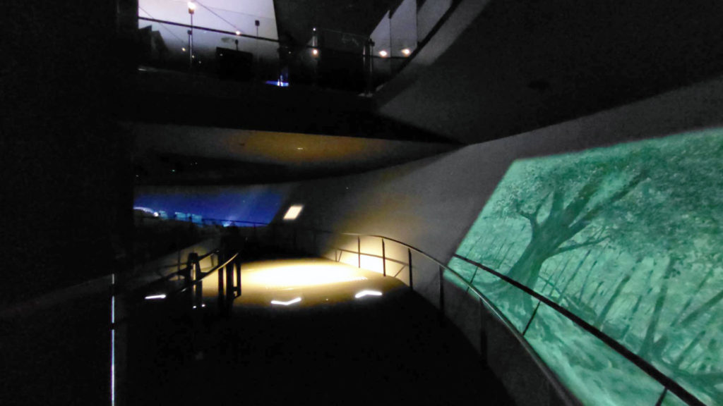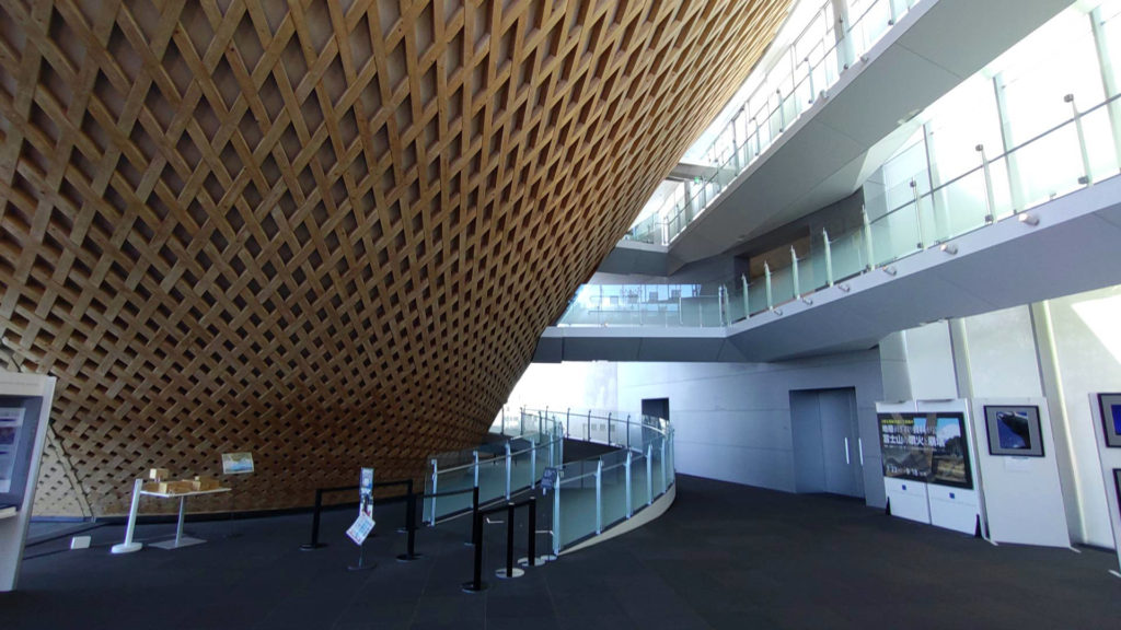 逆台形の構造物の中に入ると外周にそってスロープで徐々に登っていくようになり外側の壁にタイムラプスの映像などが投影されていて富士山を登る雰囲気を体験できるようになっていました。上まで登り切ってからは富士山についての色々な展示がある小部屋や大きなスクリーンがある映像シアターなどに立ち寄りながら下まで降りていくようになっていました。