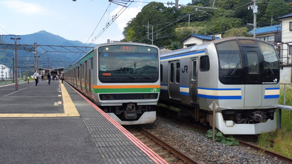 湯河原駅から東海道線の列車に乗ります。車両はE231系1000番台。湯河原駅に何故か横須賀線などで使われているE217系電車が停まっていました。(前日来た時も停まってました)