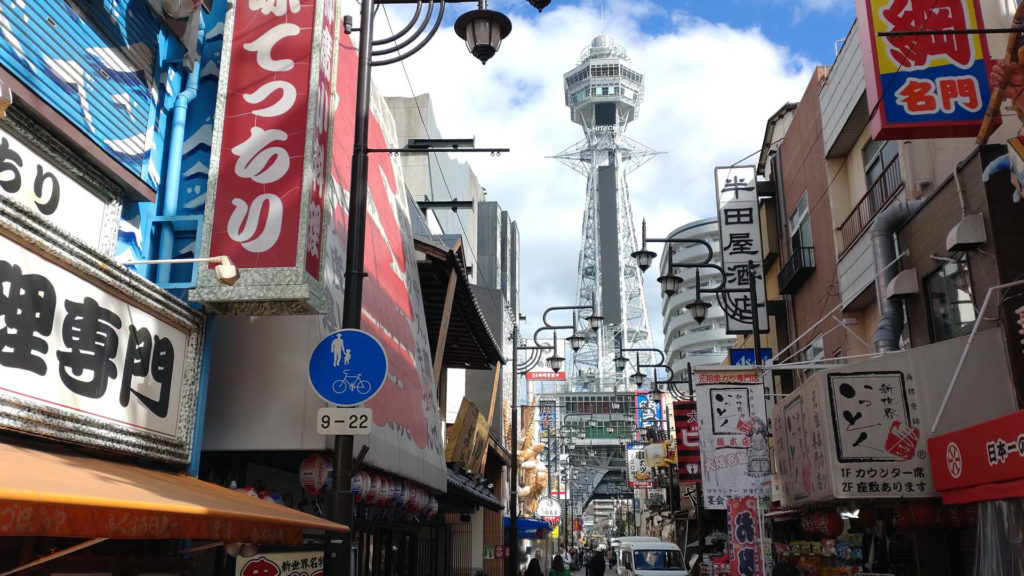 ジャンジャン横丁を抜けてちょっと歩くと通天閣が見えてきました。ジャンジャン横丁も含めてここら辺は新世界と呼ばれている地域のようです。
