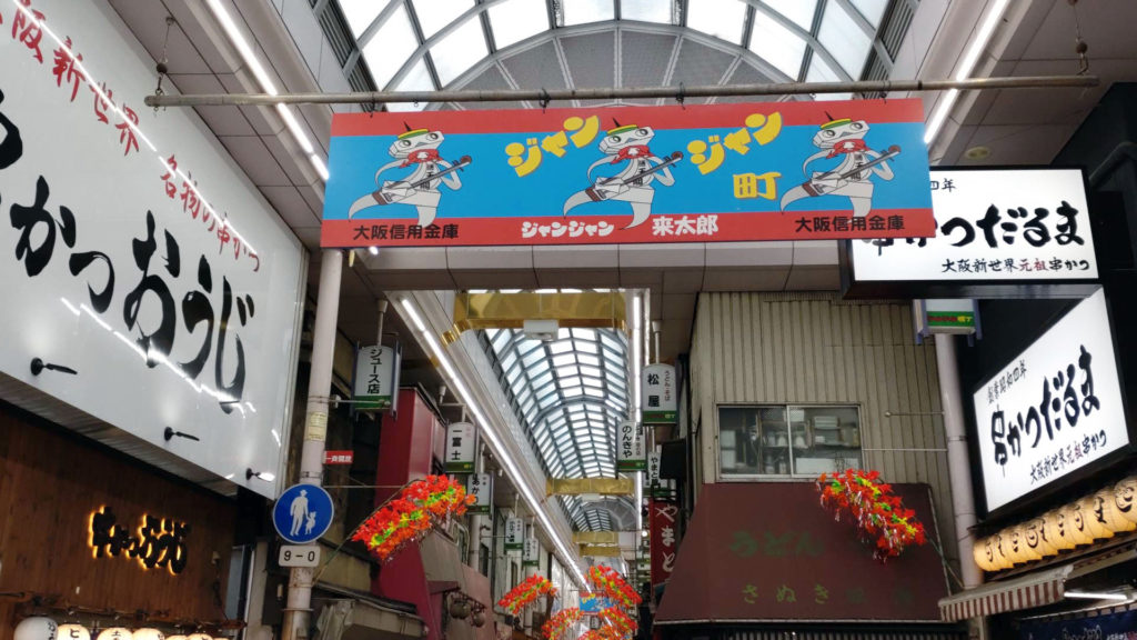1つめの目的地には鉄道で移動すれば速いのですがまだ時間帯が早いのでお店がやっていないのと初の大阪で色々見て回りたいのでまずは歩いて移動します。宿の近くのジャンジャン横丁という飲食店が並びアーケードがある飲食店街を進んでいきます。
