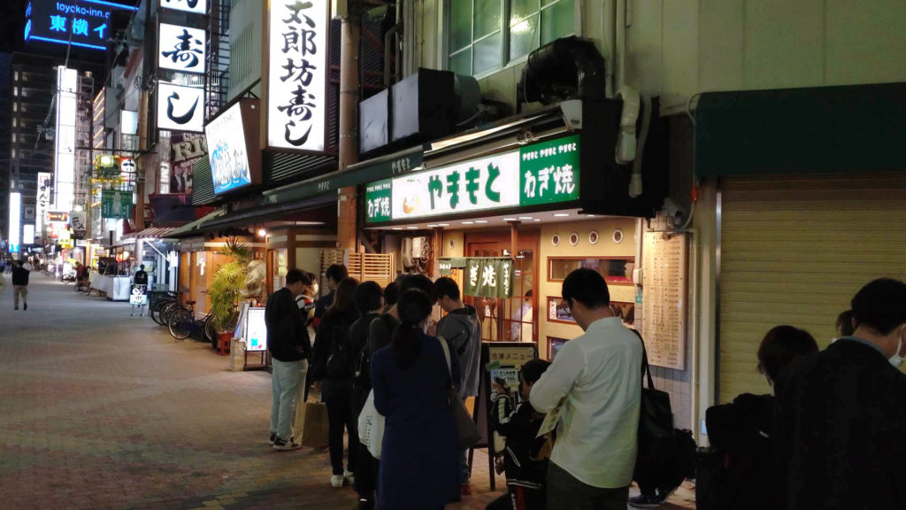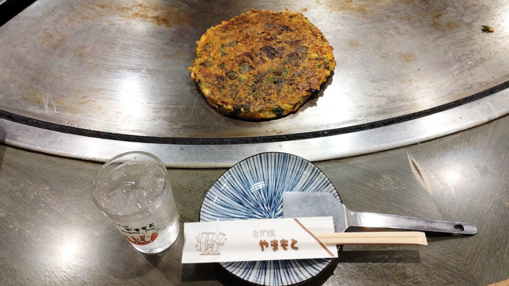 ねぎ焼やまもと 本店に来ました。ねぎ焼きというネギがたっぷり入ったお好み焼きの発祥のお店でねぎ焼きやお好み焼き、鉄板料理や焼きそばなどが食べられます。土曜日の夜だったのもあって行列ができていて1時間以上待ちでした。十三駅から徒歩で5分くらいのところにあるお店で他にも大阪にいくつか支店があるようです。店内はカウンター席でそれぞれの席の前に鉄板があり、カウンターの奥の厨房のスペースで作られたお料理が席の鉄板に置いてもらえて提供されたお料理をを最後まで熱々で食べれます。