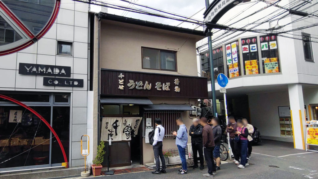 千とせ 本店 に来ました。以前からずっと来てみたいと思っていたお店に遂に来ることができました。10:30開店だったので10:15分位に到着すると20人くらいの行列。そのまま並び1時間弱並んで食べる事ができました。食べた後に外に出ると50人くらいは並んでいたので並ぶ時間が短い方が良い場合は開店前から並ぶのが良さそうです。僕はせっかくなので本店で食べてみたいと思い本店に行きましたが近くにある なんばグランド花月にもお店があるようでそちらは夕方までの営業時間みたいです。店内に入るとすぐの所に食券の券売機があります。店内はテーブル席が4つほどで店内に入ってからの提供時間は早かったです。