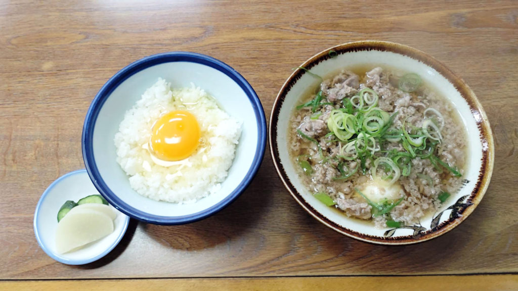 肉吸いと小玉をいただきました。肉吸いは肉うどんのうどん抜きから始まったメニューらしく、あっさりとした味の出汁に旨味がある牛肉がたっぷり入っています。お肉の他には半熟卵とネギ。小玉は少な目の卵かけごはん。漬物も箸休めに良いアクセントでした。卓上には醤油、七味、お店オリジナルの出汁醤油(卵かけご飯用)がありました。念願のお店で美味しいものを食べれて大満足でした。
