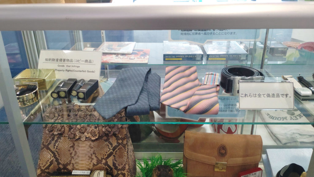 税関コレクションの展示を細かく見てきましょう。知的財産侵害物品(コピー商品)でこちらはアパレル関係を中心としたラインナップ。(2025年11月追記)
