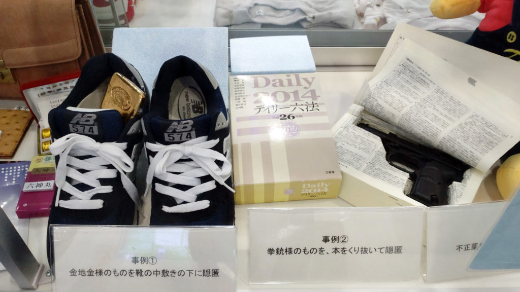 事例①は金地金様のものを靴の中敷きの下に隠匿。金を密輸して国内で売却すると消費税分の金額を不正して入手出来てしまいます(詳しくはインターネットで検索してください)。事例②は税関展示室あるあるの拳銃様のものを、本をくり抜いて隠匿です。(2025年11月追記)