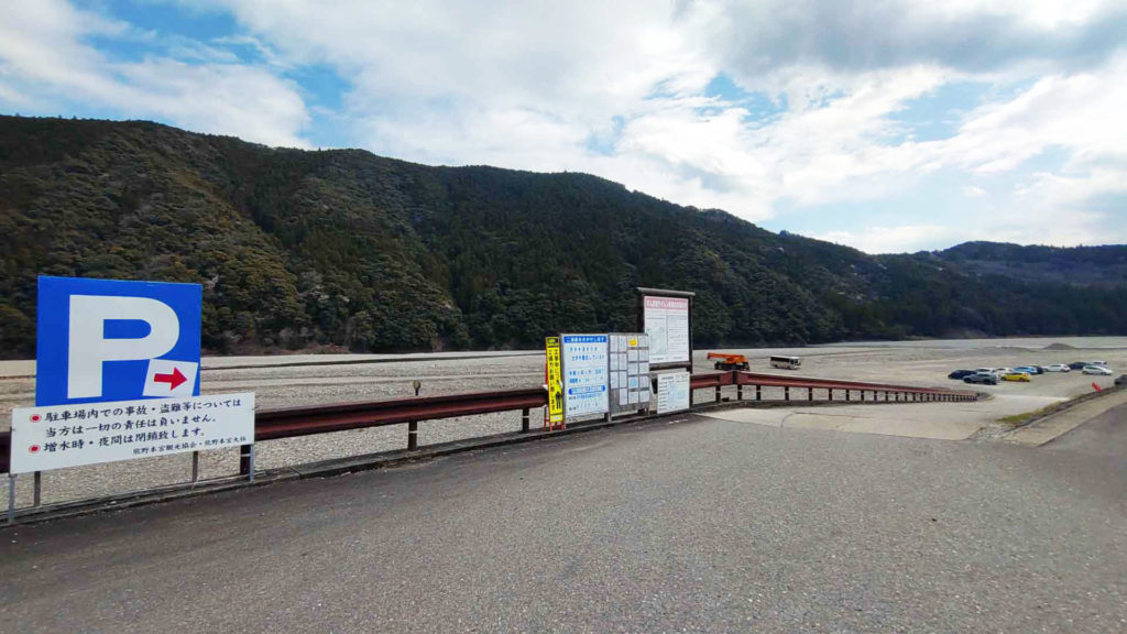 熊野本宮大社の河川敷駐車場へ。他にもっと近くにも駐車場があるようでしたが国道からも分かりやすくて広くて停めやすかったのでこちらの駐車場にしました。お詣りする人は無料で停める事ができます。河原の駐車場かなり広かったです。