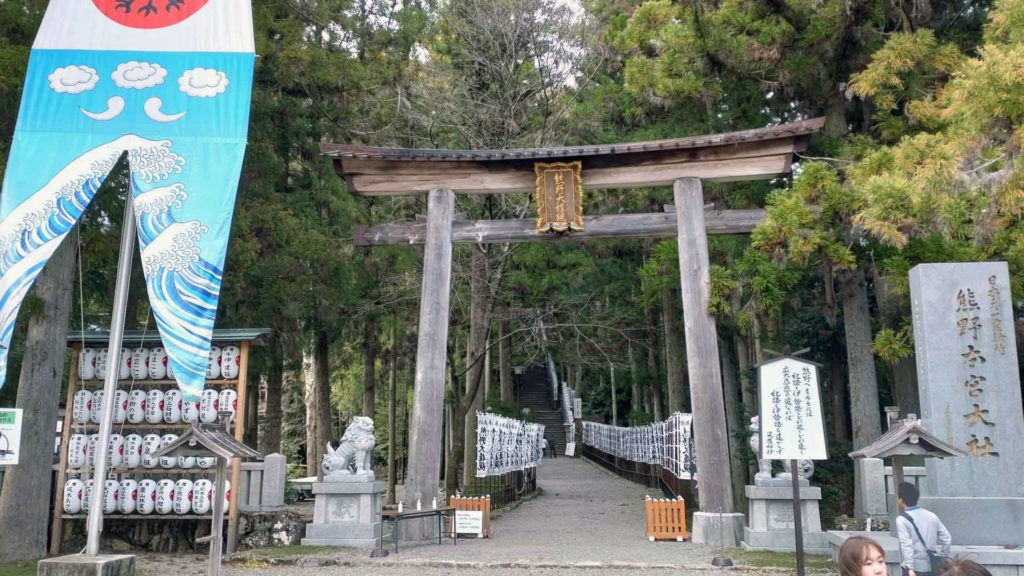 熊野本宮大社の大鳥居です。先ほどの駐車場からは徒歩で5分位でした。鳥居の先に階段があり登っていきます。