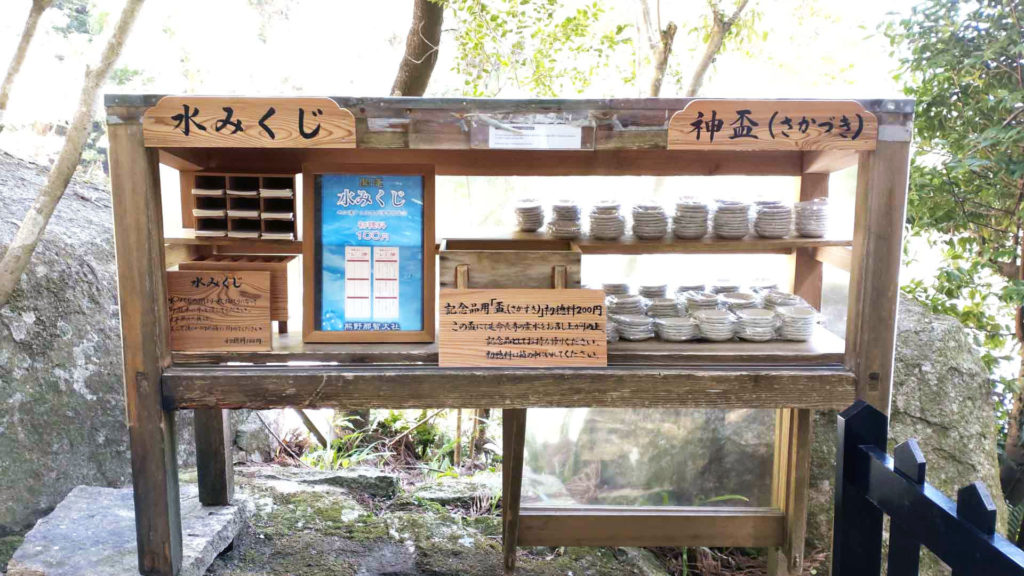 受付の先には水に浸けると文字が出てくる水みくじと神盃が。初穂料を納め神盃を受けます。