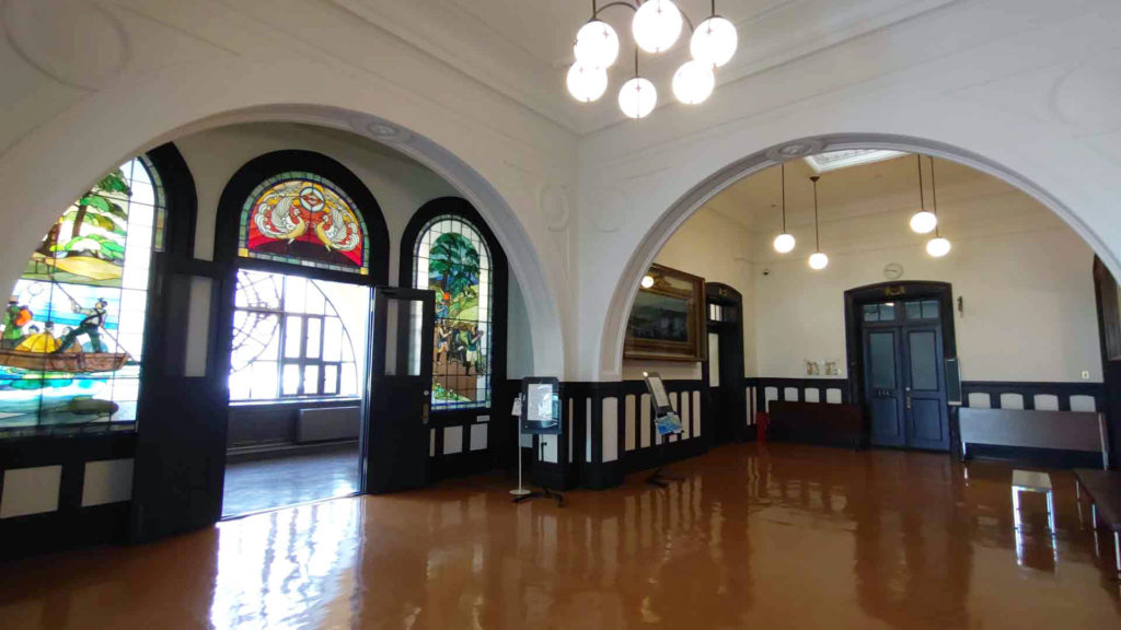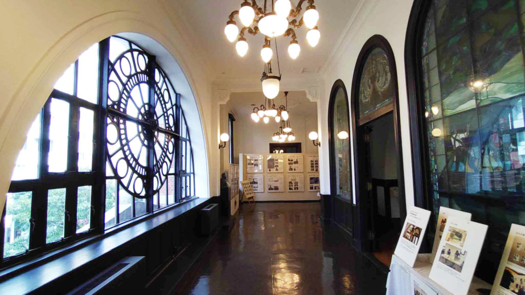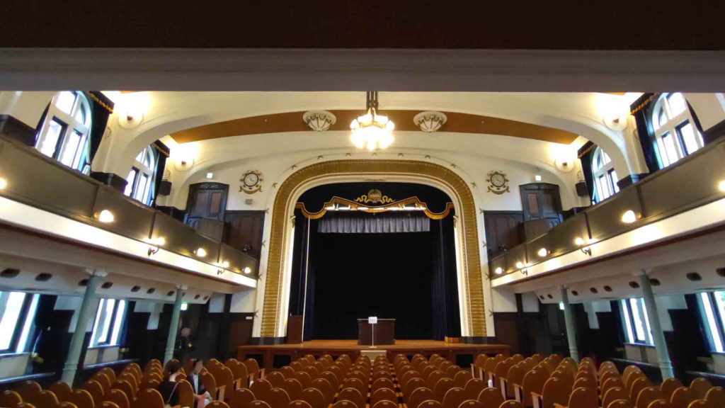入口から真っ直ぐ進むと1階から2階にかけて吹き抜けになっている講堂がありました。風格がありますね。