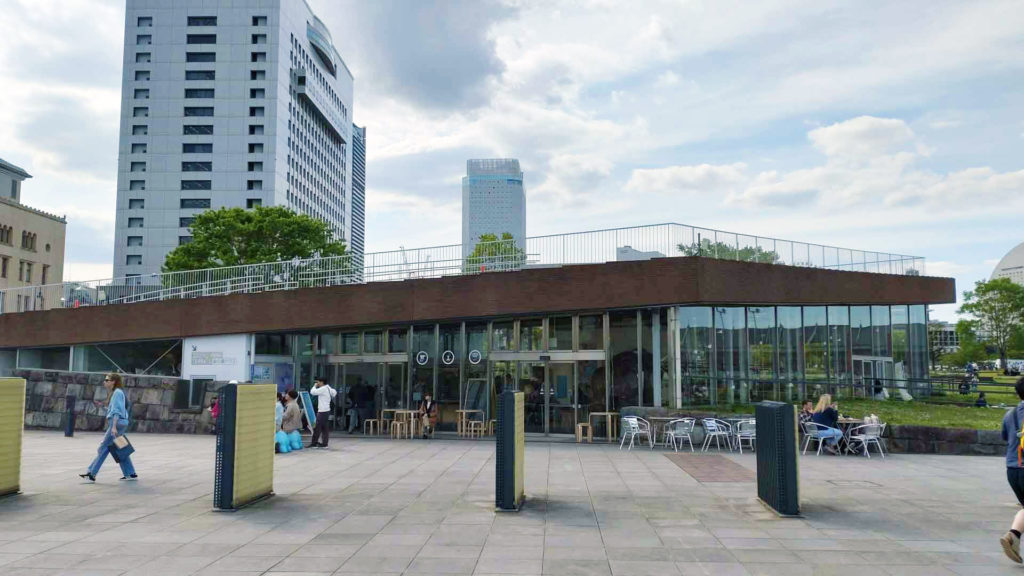 横浜税関の近くまで戻ってきて像の鼻パークにある象の鼻テラスで休憩するとにしました。像の鼻というのは横浜港が開港してしばらくした頃に波止場を上から見た形状が像の鼻に似ているという事でこの地区が像の鼻と呼ばれるようになったそうです。像の鼻テラスの中には象の鼻カフェというカフェがありドリンクやスイーツ、軽食やおつまもなどが販売されています。像のカフェテラスの入り口から入って左側にあるカウンターで注文します。