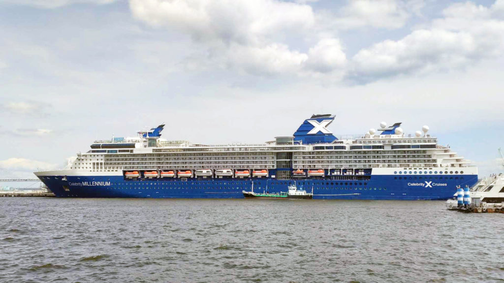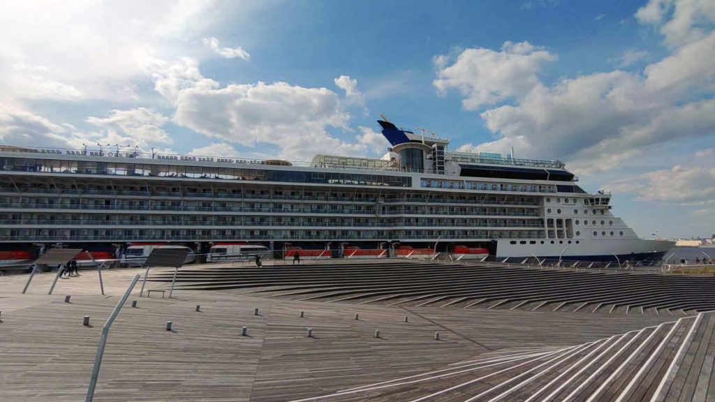 どうやら前日に清水港に泊まっていたのを見かけた船がこの日は横浜港に到着していたようです。セレブリティ・ミレニアムという船で4/21日に横浜港を出発し日本のいくつかの港に寄ったり韓国まで行ったりして5/2に横浜港に戻ってくるというクルーズだったようです。(5/1の予定は富士山(清水)と書いてありました清水港を前日夜に出発して横浜にはこの日の朝に到着していたようです。)