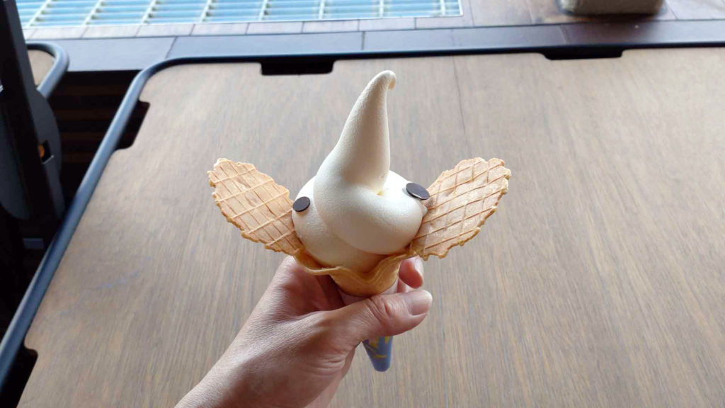 ゾウノハナソフトクリームを頂きました。しっかりとした硬さのソフトクリームがコーンにのっていて長く伸びたソフトクリームの先が象の鼻のようです。食べているとサクッとした薄いクッキーの耳とチョコの目がアクセントになります。クッキーにソフトクリームを付けて食べるのも美味しかったです。