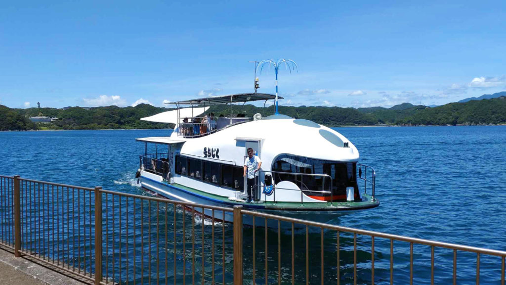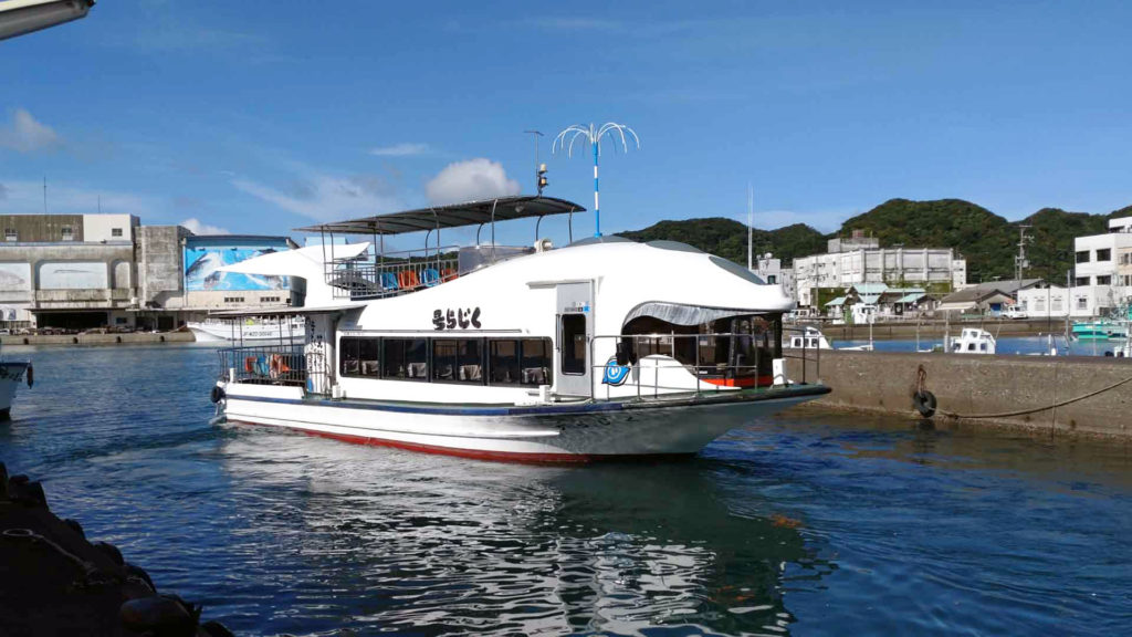 勝浦観光桟橋から紀の松島観光の紀の松島めぐり遊覧船くじら号に乗ります。クジラ風のデザインの船で2階建てになっています。