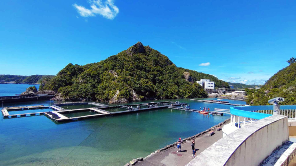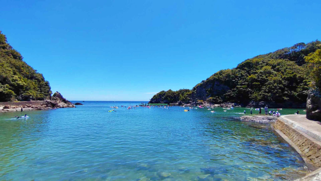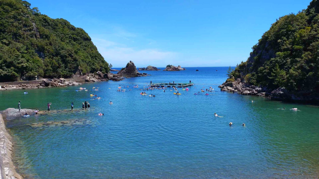 くじら浜海水浴場という海水浴場です。ここは夏の海水浴シーズンにクジラ(2頭のハナゴンドウという3~4メートルくらいの小型のくじら)と一緒に泳ぐことができます。イケスの中にいるクジラをお昼前後の2時間くらいの間海水浴場の中に放ち、その時間にクジラと一緒に海水浴を楽しむ事ができます。小さな入り江にある海水浴場ですがシャワーや更衣室、トイレなども用意されています。