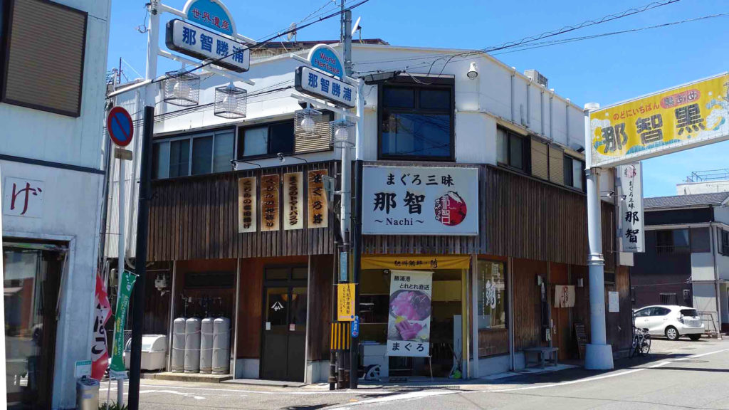 まぐろ三昧那智は紀伊勝浦駅から徒歩5分位。高速バスも発着する那智勝浦バスターミナルも道を挟んで斜め向かいあたりにあります。