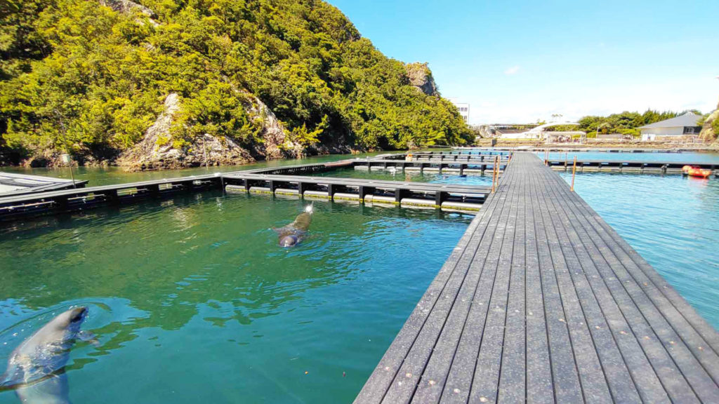 自然プールにあるふれあい桟橋エリアではイルカに餌をあげたりもできます。