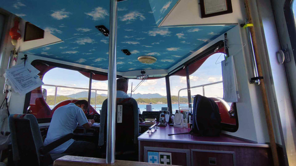 2階の最前列に座る事ができました。僕は乗り物酔いをしやすい(鉄道と自分で運転する車以外は酔います)ので酔い止め薬を飲んでおきました。湾内は揺れは少なかったですが、外洋に出てからはそこそこ揺れがあったので酔いやすい人は酔い止めを飲んでおいた方が安心だと思います。