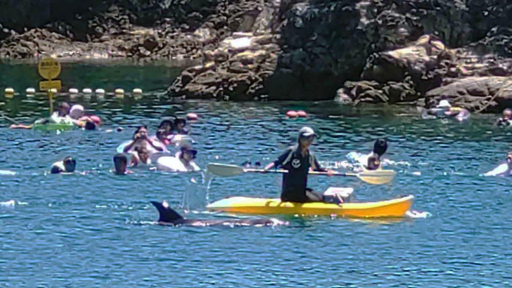 こちらのクジラはくじらの博物館で飼育されているそうで飼育員さんがカヌーに乗って誘導していました。陸からは結構離れている場所でクジラが泳げるくらいの深さは有る場所なので浮き輪やライフジャケットなどを使って楽しむようです。僕はあまり時間が無かったので見学だけでした。