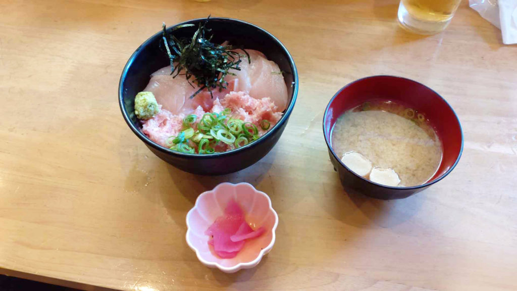 まぐろ+ネギトロ=二色丼を頂きました。こちらのお店の丼ものメニューの中で一番人気のメニューとのことです。ご飯の上にまぐろの切り身とネギトロがのっていて美味しかったです。まぐろはすぐ近くの勝浦港で水揚げした生マグロ。ネギトロはメバチ、キハダ、びんちょうを叩いて作ったものだそうです。丼の他に味噌汁と漬物もついてきました。