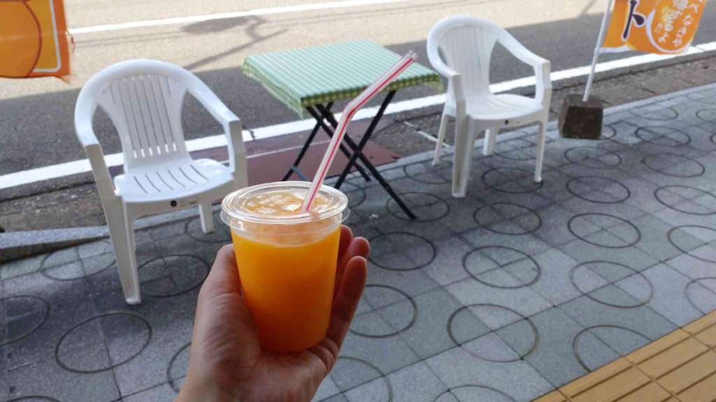 列車に乗る前に前日にシャーベットを頂いた中西商店に寄り温州みかんジュースを頂きました。スッキリとした飲み口とみかんの味をダイレクトに感じる味で甘みもあり美味しかったです。