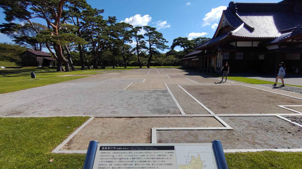 箱館奉行所は建物の1/3が復元されていますがそれ以外の場所の跡地に地面に建物があった場所がわかるようになっているところもありました。復元する時に大きな建物になると法令で防火シャッターを設置しないといけないため今の部分のみの復元になったらしいです。