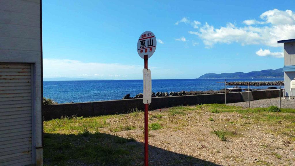 宿の最寄りにあるバス停で降ります。バス停のすぐ近くに海が見え良い景色でした。