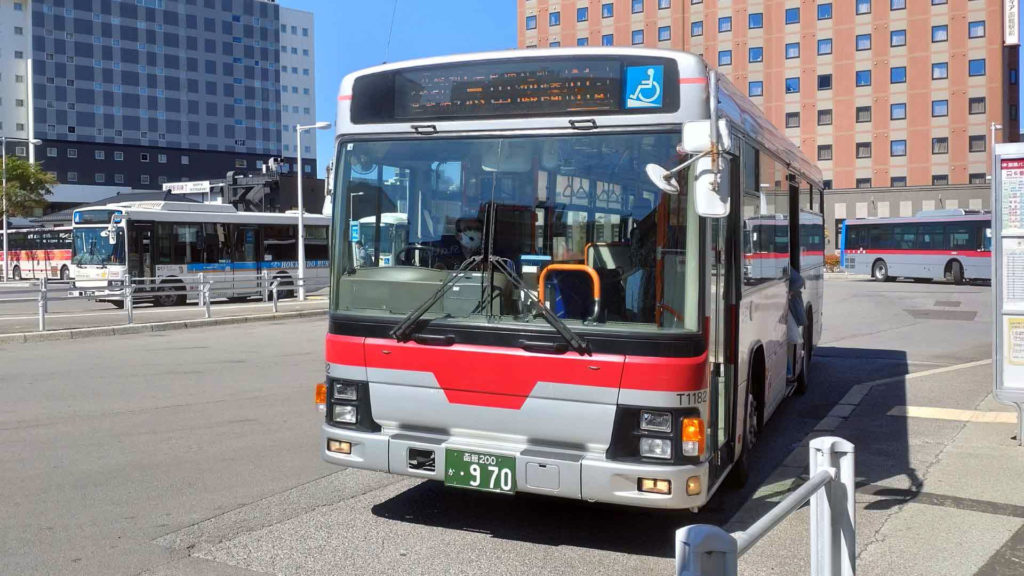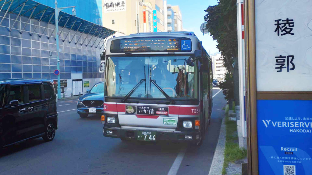 函館駅前のバス停から函館バスの路線バスに乗ります。車両はいすゞの大型バス エルガ。