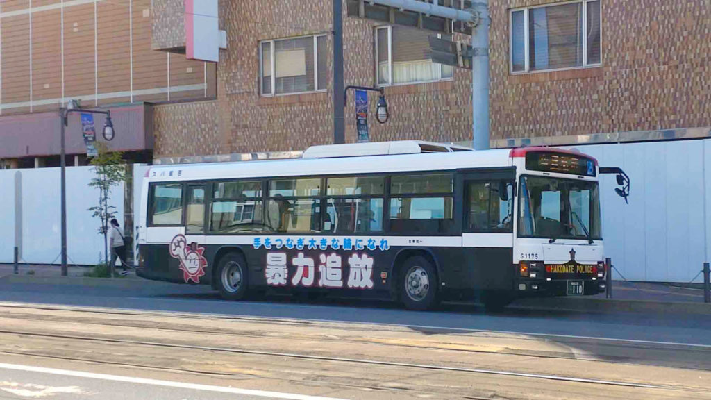 函館駅近くに暴力追放ラッピングバスが停まっててテンション上がりました。警察車両のようにも見えますが普通の路線バスのようです。