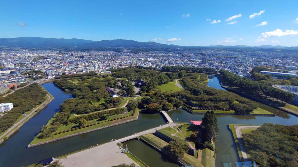 展望台からはすぐ近くに五稜郭が見えます。写真などでは何度も見た事あった五稜郭の実物にテンション上がります。タワーと五稜郭は結構近くなのでスマホのカメラだと一番広角にしてギリギリ入る感じでした。