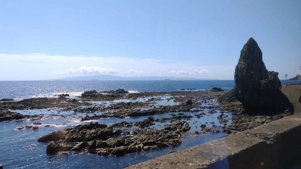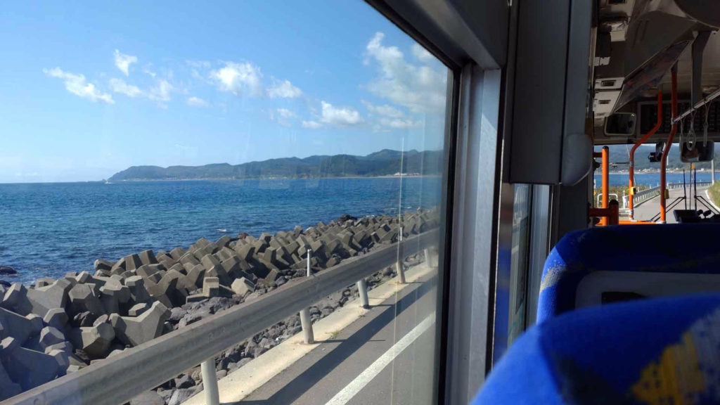 この先のトンネルは日浦洞門と呼ばれている7つの短いトンネルが続く区間ですが、日浦海岸に沿った道で途中の岩を手掘りで掘って作ったトンネルなんだそうです。バスがギリギリ通れるくらいの道とトンネルでした。この区間は2025年4月からはルート変更でこの路線バスが通らなくなってしまったそうです。この時はただ景色の良さに感動でしたが路線バスでこの道を通る事が出来なくなってしまった今となっては貴重な体験でした(レンタカーとかで自分の運転だと景色を楽しむのは難しいですし)