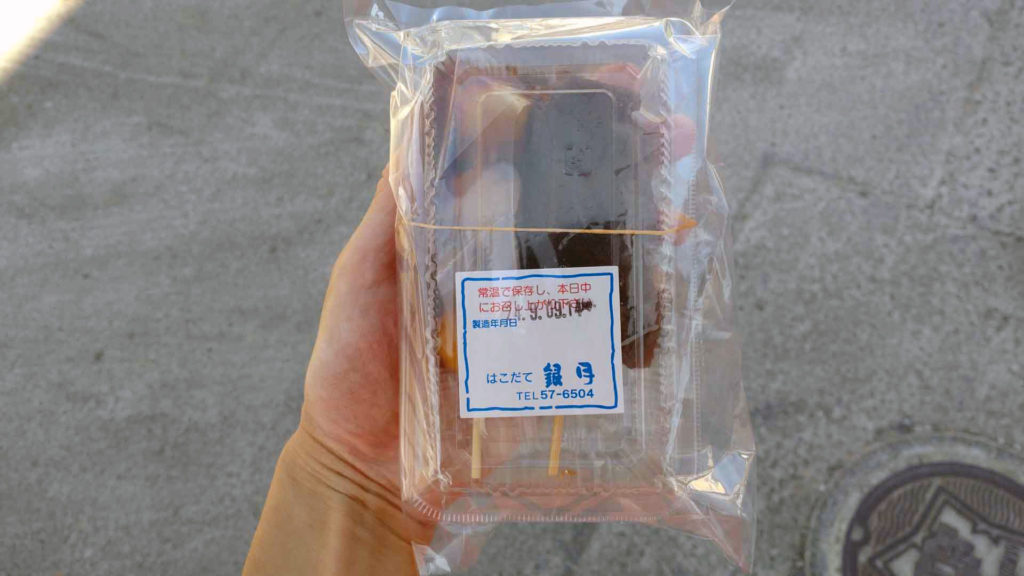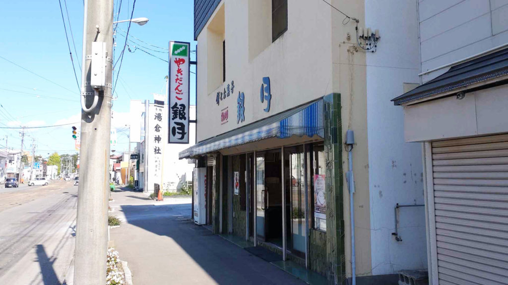 銀月 というお店に来ました。1966年創業の和菓子店で焼き団子や饅頭、大福、どら焼きなどを製造販売しています。1日目に一緒に観光してくれた友達が湯の川温泉行くならこのお店のお団子が美味しいと教えてくれていたので寄ってみました。