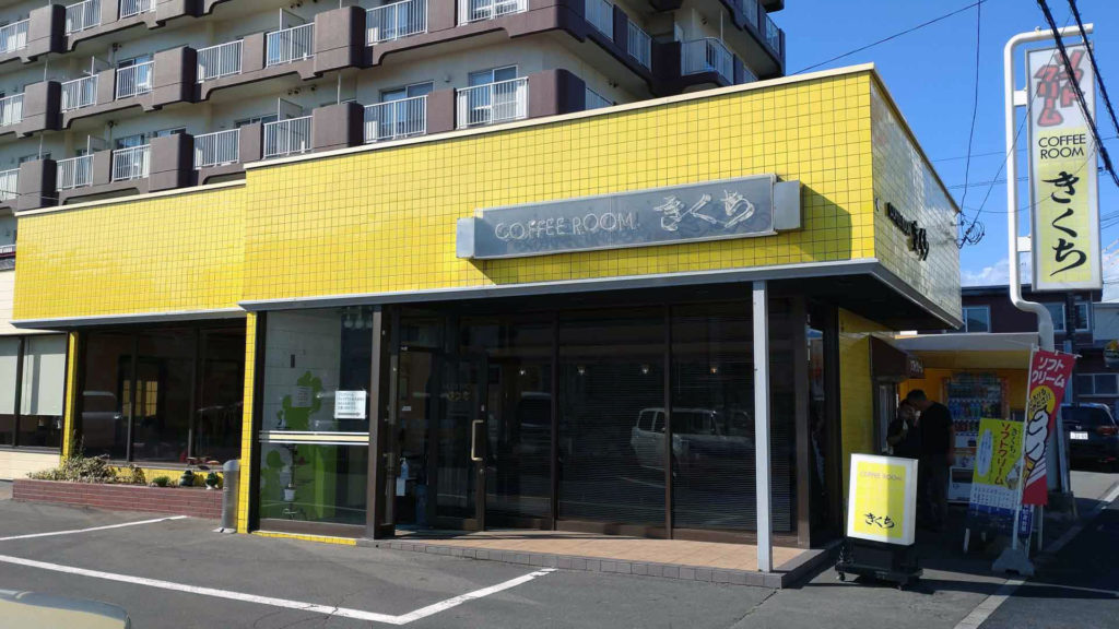 COFFEE ROOMきくち というお店です。店内でコーヒーなどのドリンクや軽食を頂く事ができる他、道沿いにある窓口でテイクアウトのソフトクリームも購入できます。今回はここのソフトクリームを食べてみたいと思い寄ってみました。人気があるお店のようで店内で飲食する方で駐車場はほぼ埋まっている他、外のテイクアウトカウンターで購入できるソフトクリームを買いに来る人もひっきりなしでした。
