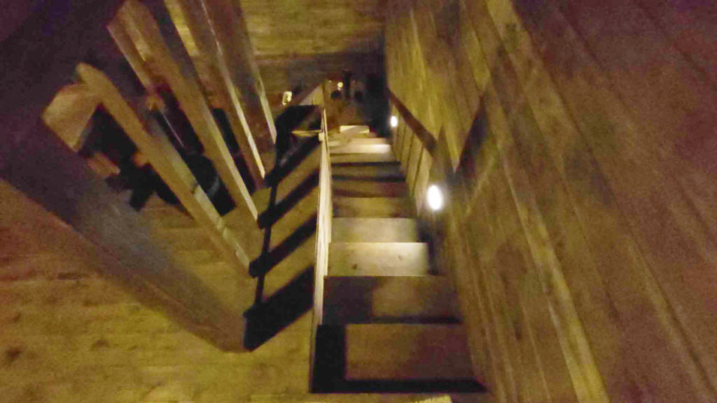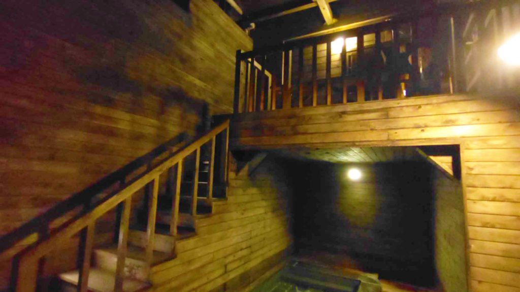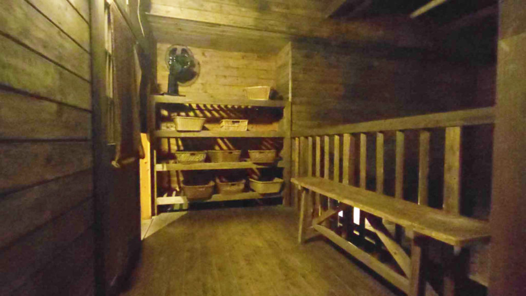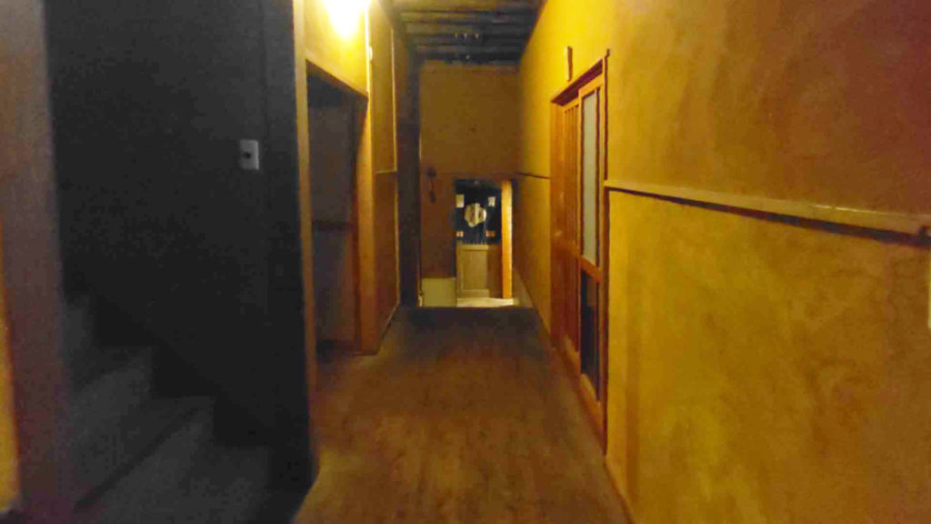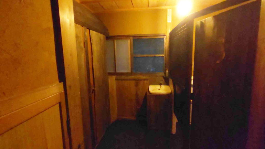 階段を降りた所から脱衣所の方を眺めるとこんな感じでした。浴室がある場所は玄関などがある1階から下った地下部分にあり高さ的には宿の前を流れる川に近いようです。