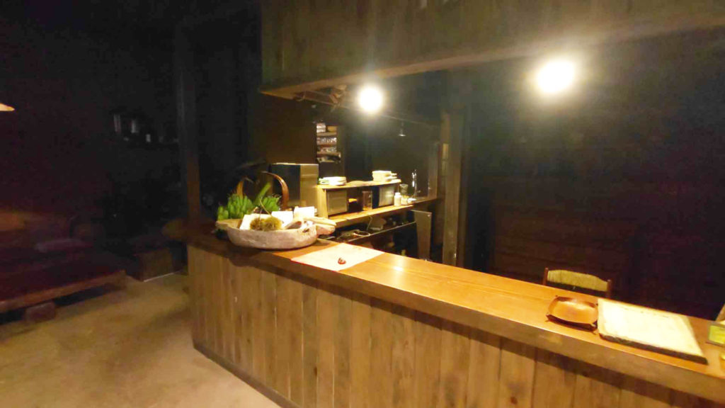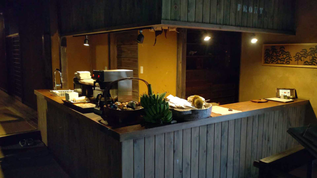 玄関を入ってすぐのところにフロントカウンターがありこちらでチェックインをしてもらいました。日帰り入浴もできるのでその場合もこちらが受付のようです。玄関付近は土足で歩けるエリアで玄関から右に曲がった所と左に曲がった所それぞれに靴を脱ぐスペースがありました。建物の中の明かりは全体的に控えめな明るさで落ち着いた雰囲気でした。