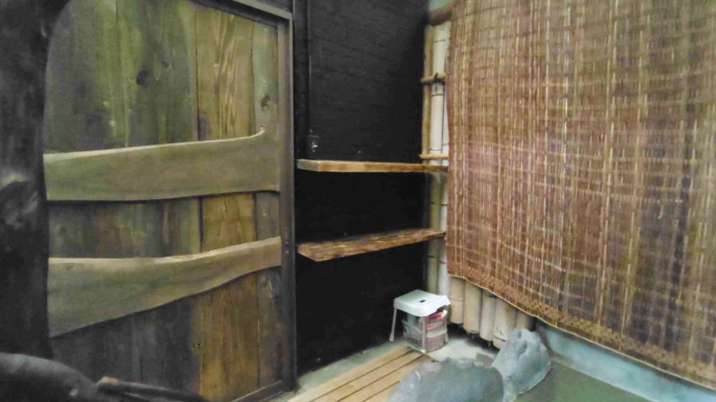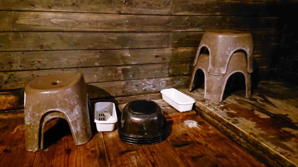 シャワーやカランがある洗い場は無く貯めてある温泉のお湯を桶で汲んで使用します。