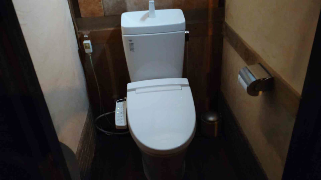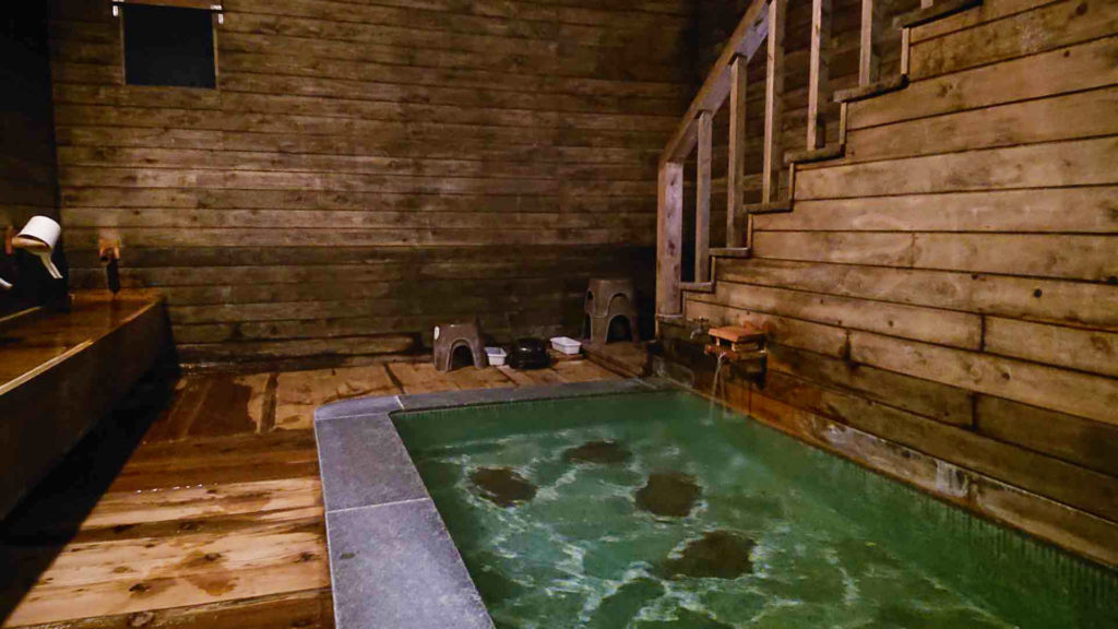 浴槽から脱衣所がある1階部分まで吹き抜けですが明かりが入ってくる窓から遠いので昼でも夜でも浴室は暗めで落ち着いた雰囲気でした。壁や床などはヒノキが張られていますが旅館からTojiyAに改装する際にこの内装になったようです。