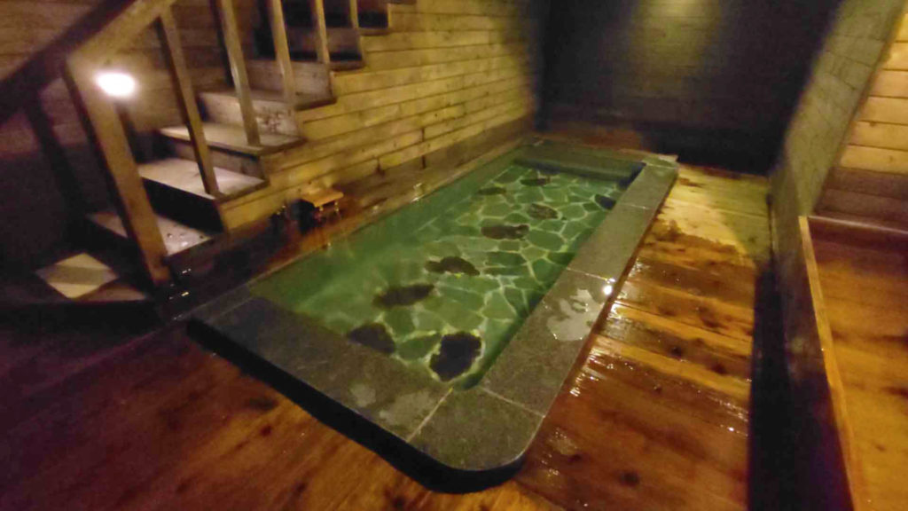 貸し切りで使用できる露天風呂もあります。露天風呂は建物の大浴場とは反対側の奥の方にあるので大浴場からは一旦靴を履いて玄関前を通って靴を脱ぎ廊下を歩いて行って右に曲がった所にありました。貸切の予約は必要なく空いていれば利用可能で使用中の札をかけて扉の鍵をかけて使用します。